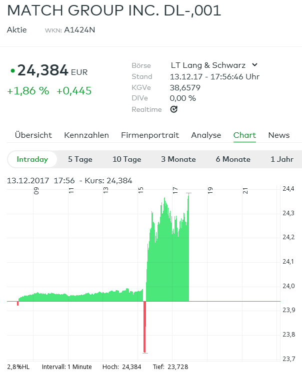 Basierend auf den Reingewinnzahlen ist ein Börsengang immer teuer, jedoch gibt es mit Tinder eine starke virale Hoffnung, deren Monetarisierung erst am Anfang steht Bewertung 8,0/10 => Faires KGV Das faire KGV wurde aus der investresearch Aktienbewertungsmethode abgeleitet Aktien kaufen Sie idealerweise mit dem besten Online Broker. TinderAktie setzt Erholungskurs aus Während das Unternehmen alles daran setzt, weiter zu wachsen, gerät der Kurs der TinderAktie aufgrund der schlechten Gesamtmarktlage deutlich unter Druck. Der Hauptkatalysator war Matchs wichtigste App Tinder, die ihre Abonnenten um 41 % jährlich und 11 % sequenziell auf 5,2 Millionen im Quartal steigerte Ich denke, dass Investoren die Aktien von Match schrittweise kaufen können Die Aktie ist selbst auf dem Allzeithoch noch ein guter Kauf, aber ein Rückgang des Marktes könnte die.