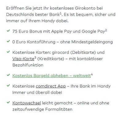 Comdirect Almost exactly the same as DKB and N26, Comdirect is a completely online banking system which means there are no branches to actually visit in person If you do not mind managing your account completely online, Comdirect is a great banking choice Includes FREE Girocard and FREE Visa credit card Signup bonus of up to 150 Euros. Ich zahle immer mit der VISA;. Comdirect Comdirect offers very similar conditions to the DKB There are no monthly account fees or income required to open the account Within Germany, however, customers can only use the approx 9,000 ATMs of the Cash Group banks to withdraw cash free of charge In foreign countries, Comdirect customers can use all Visa machines for free cash.