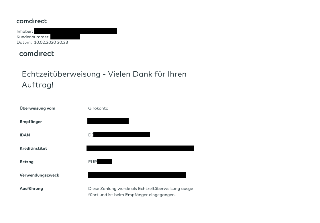 I have a comdirect account, and I need to transfer some money to an embassy (to a certain IBAN in Commerzbank), and give them an official receipt from a bank, online banking printout won’t do comdirect support told me that they can issue an “Überweisungsbestätigung” by post for 14,90€. The International Bank Account Number (IBAN) is an internationally agreed system of identifying bank accounts across national borders to facilitate the communication and processing of cross border transactions with a reduced risk of transcription errors An IBAN uniquely identifies the account of a customer at a financial institution. IBAN for Comdirect Bank in Germany consists of up to 22 characters.